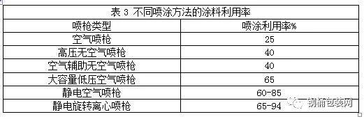 涂裝過程中常以噴涂形式使用涂料,在噴涂過程中產(chǎn)生較多漆霧,漆霧是噴漆廢氣中的顆粒物來源,因此,提高涂料利用率可以大大降低廢氣中的顆粒物,降低廢氣處理難度。不同噴涂方法的涂料利用率見表3所列。
