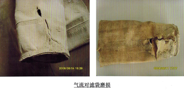 除塵器布袋在使用過程中經(jīng)常會出現(xiàn)除塵器濾袋口損壞的現(xiàn)象,而且這一現(xiàn)象出現(xiàn)還是比較嚴重的,到底是何原因致使除塵布袋漲圈下面20公分左右出現(xiàn)損壞呢?主要原因_是袋式除塵器的噴吹管上面打的噴吹眼不正,袋式除塵器噴吹管不正會直接影響除塵濾袋的使用壽命,濾袋的破損出現(xiàn)在距袋u向下左右處,此處???為側(cè)面破損沿噴吹管方向連續(xù)幾個排列,在煙氣流也方向側(cè)磨損較重,有的濾袋甚至發(fā)生圓周性斷裂,其破損應為氣體攜帶灰粒由內(nèi)向外向下沖刷而成,濾袋內(nèi)部出現(xiàn)由上至下的大片織布磨損現(xiàn)象,并露出自色PTFE基布,分析原因為噴吹管噴吹時夾帶灰粒氣流被煙氣引流導致氣流偏斜至煙氣流出方向。對于針刺濾袋一部分_細粉塵進人纖維層內(nèi),噴吹氣流在清灰時因氣流不暢,不能很好將能量釋放,在袋內(nèi)形成強大的氣流而沖擊濾袋,造成濾袋晃動互相磨損袋底,以及將袋底吹裂。另一部分氣流從袋日返出,從而磨損袋口。濾袋底部側(cè)壁的作用力_加強大。此時,如果噴吹壓力偏大,袋身過濾含濕量大的煙氣后透氣性變差,袋底腐蝕“塑化”、強力下降,造成濾袋底部出現(xiàn)沿袋底縫線圓周折皺折裂痕跡。第四,該除塵器使用的為鋼袋籠,外部噴涂有機硅防腐材質(zhì)。由于使用年限較長,及_換除塵濾袋時對其磕碰導致部分防腐材料脫落,出現(xiàn)不同程度的銹蝕,袋籠的銹蝕對與濾袋的磨損與腐蝕影響也較大,使袋底強度降低。
